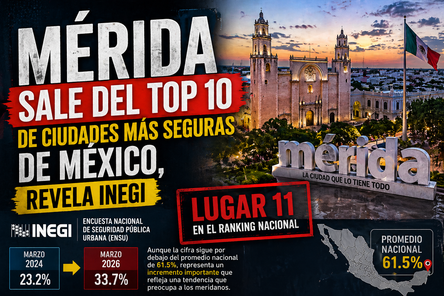 De acuerdo con la Encuesta Nacional de Seguridad Pública Urbana (ENSU), en marzo de 2026 el 33.7% de la población mayor de 18 años consideró que vivir en Mérida es inseguro. Esta cifra coloca a la ciudad en el lugar 11 entre las urbes con menor percepción de inseguridad, saliendo del top 10 donde se mantuvo durante