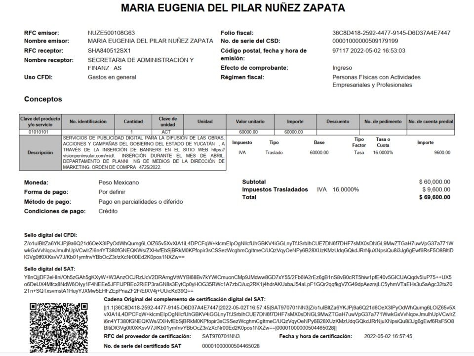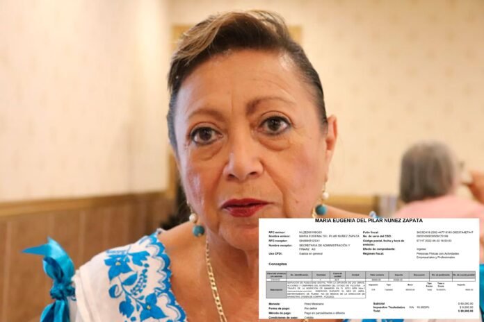 Los denunciantes afirman, facturas en mano, que María Eugenia cobró $60 mil al mes durante el sexenio de Mauricio Vila Dosal y $26,500 con Renán Barrera Concha, además de otros $13,500 por otros conceptos similares.